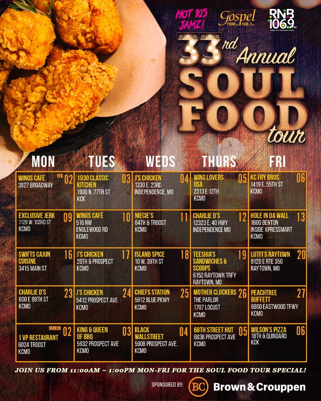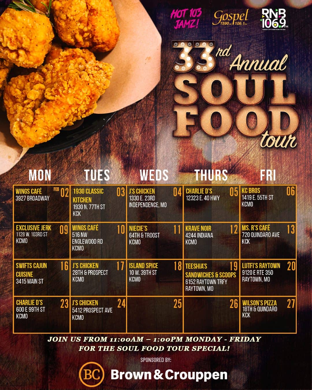 In observance of Black History Month, Hot 103 Jamz presents the 33rd Annual Soul Food Tour! Monday – Friday, 11am – 1pm. through the month of February. Experience the best soul food and amazing daily soul food specials at various restaurants throughout Kansas City!