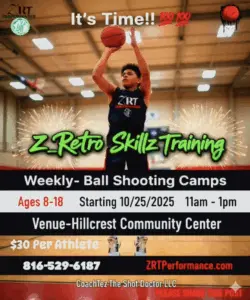 Weekly- Ball Shooting Camps – Ages 8-18 | Starting 10/25/2025 11am – 1pm | at Hillcrest Community Center $30 Per Athlete 816-529-6187 | ZRTPerformance.com